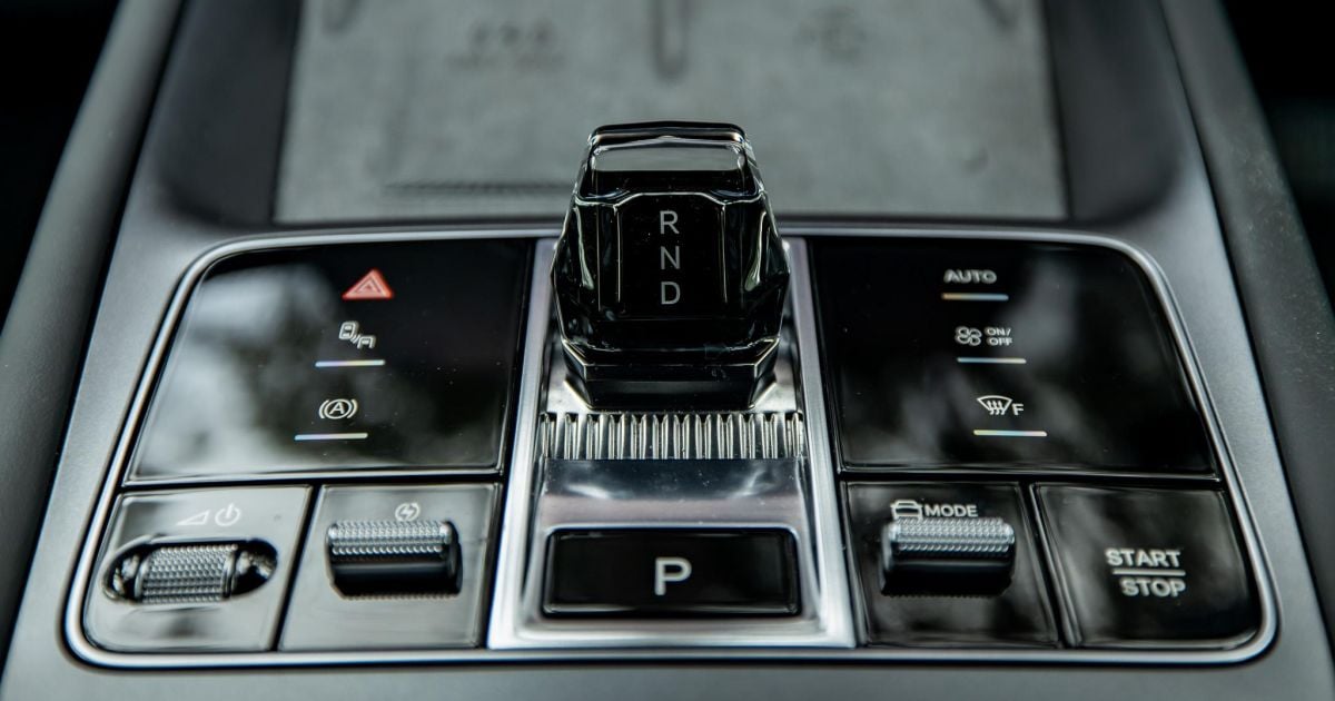 There’s a toggle-style gear selector and park brake button, and nearby is a regen braking adjustment button, as well as drive mode selection controls, and the ‘start’ button is nearby.
