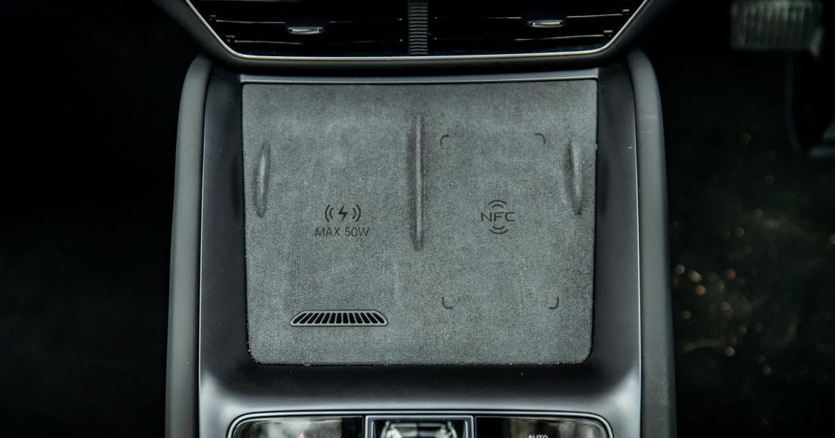 There’s an NFC card reader, which can be used as a key, or you can use your phone or a physical key. Alongside that reader there’s a 50W wireless charger for your phone with ventilation, so it won’t overheat your phone.