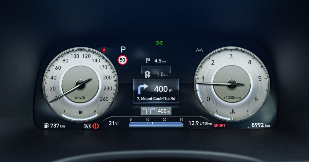 The digital instrument cluster is standard Hyundai fare, with different themes depending on drive mode but no map functionality like you’ll find in Volkswagen Group product.