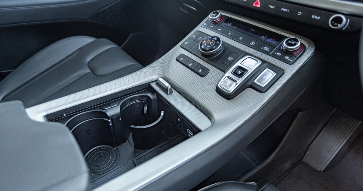 Storage is ample. There’s a cavernous centre console bin with USB-C and 12V outlets; a large pit ahead of this which can be concealed beneath a lid, and which contains deployable cupholders; bottle holders in the doors that can fit 1L bottles; and a large shelf under the centre console with another pair of USB-C and 12V outlets.