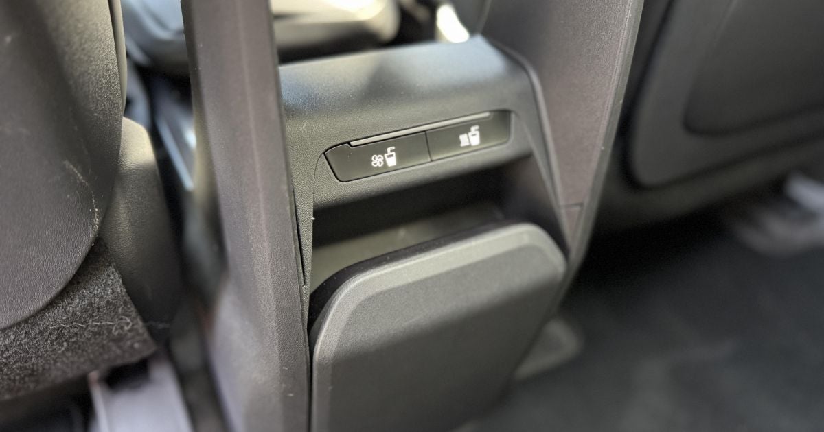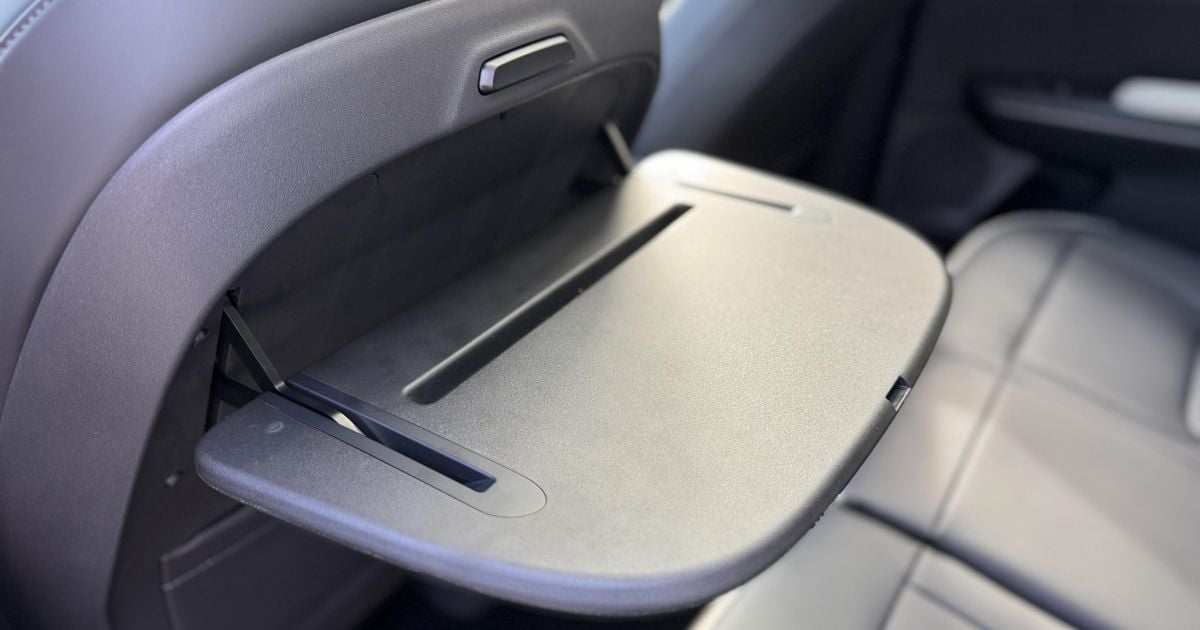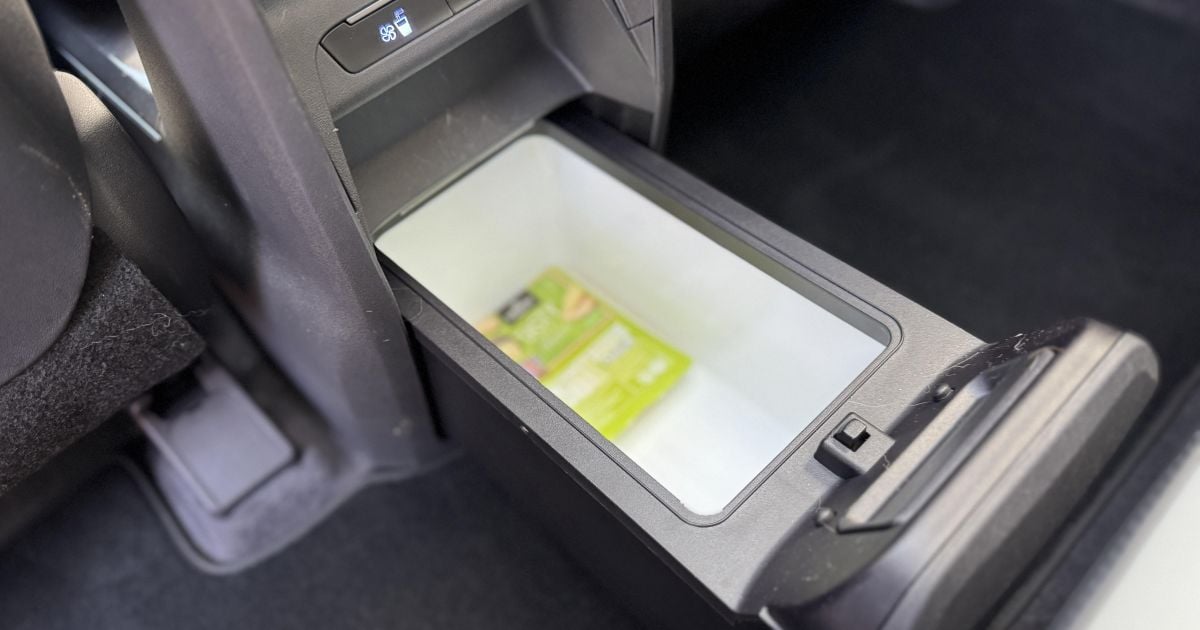 The inclusion of a fold-out desk on the back of the front passenger seat is a lovely inclusion for a kiddo on a long road trip. There’s also a sliding drawer that can be used to heat or cool items – another potential fam favourite, especially for the snackers.