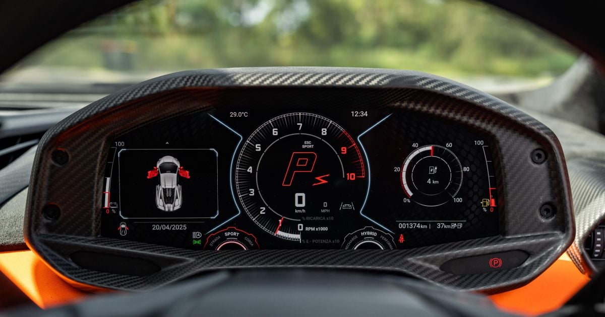 It’s almost too good to be true for a Lamborghini V12. The pedal position is not completely ridiculous! You no longer have to fold your lower half to the left in order to reach the pedals. The steering wheel is perfectly sized and allows for clear viewing of the 12.3-inch digital instrument cluster behind it.