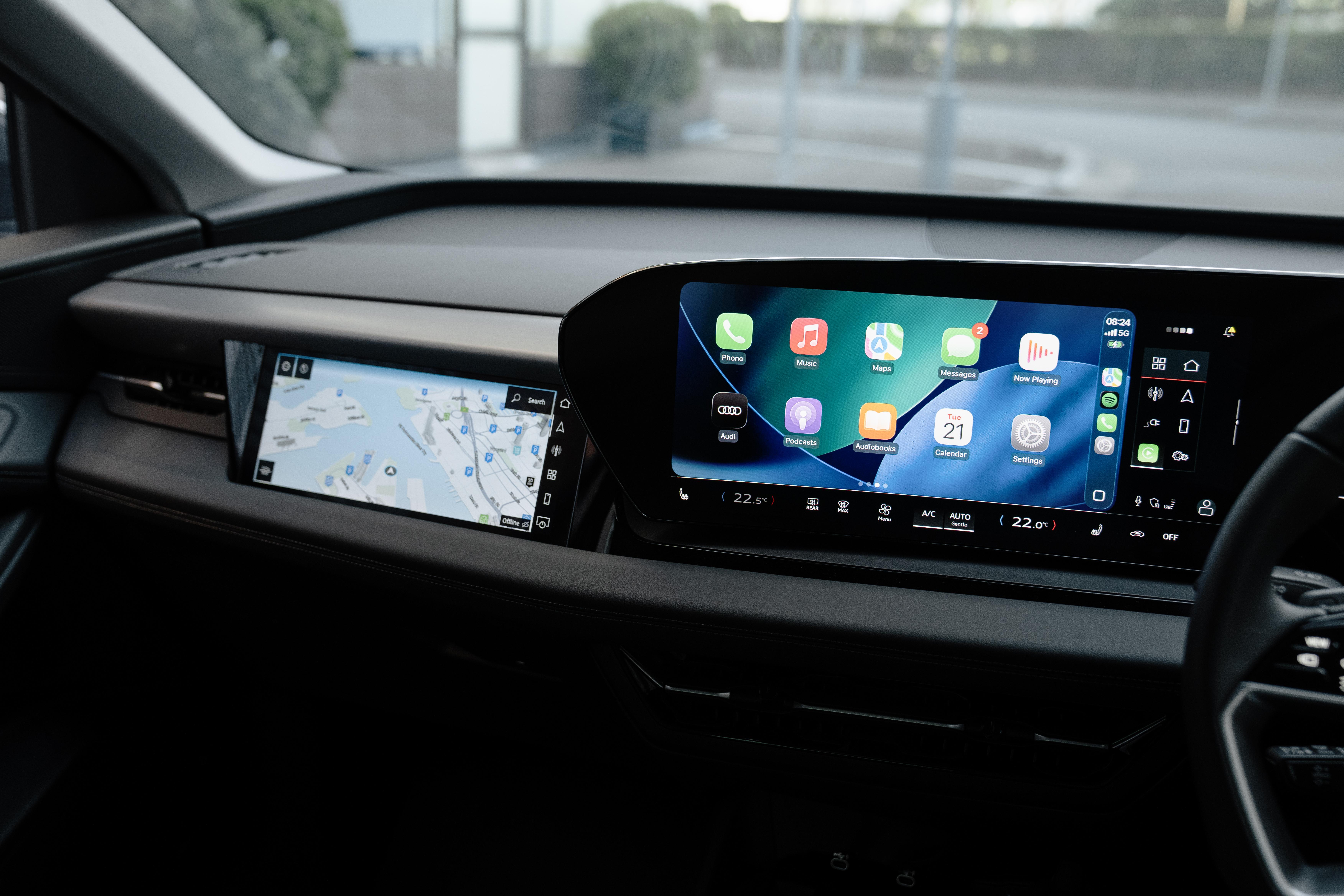 Front and centre is Audi’s new ‘digital stage’ which incorporates the virtual cockpit (digital instrument cluster) and central ‘MMI touch’ (infotainment touchscreen) displays, and in the Q6 e-tron the MMI passenger-side display is also standard-fit.