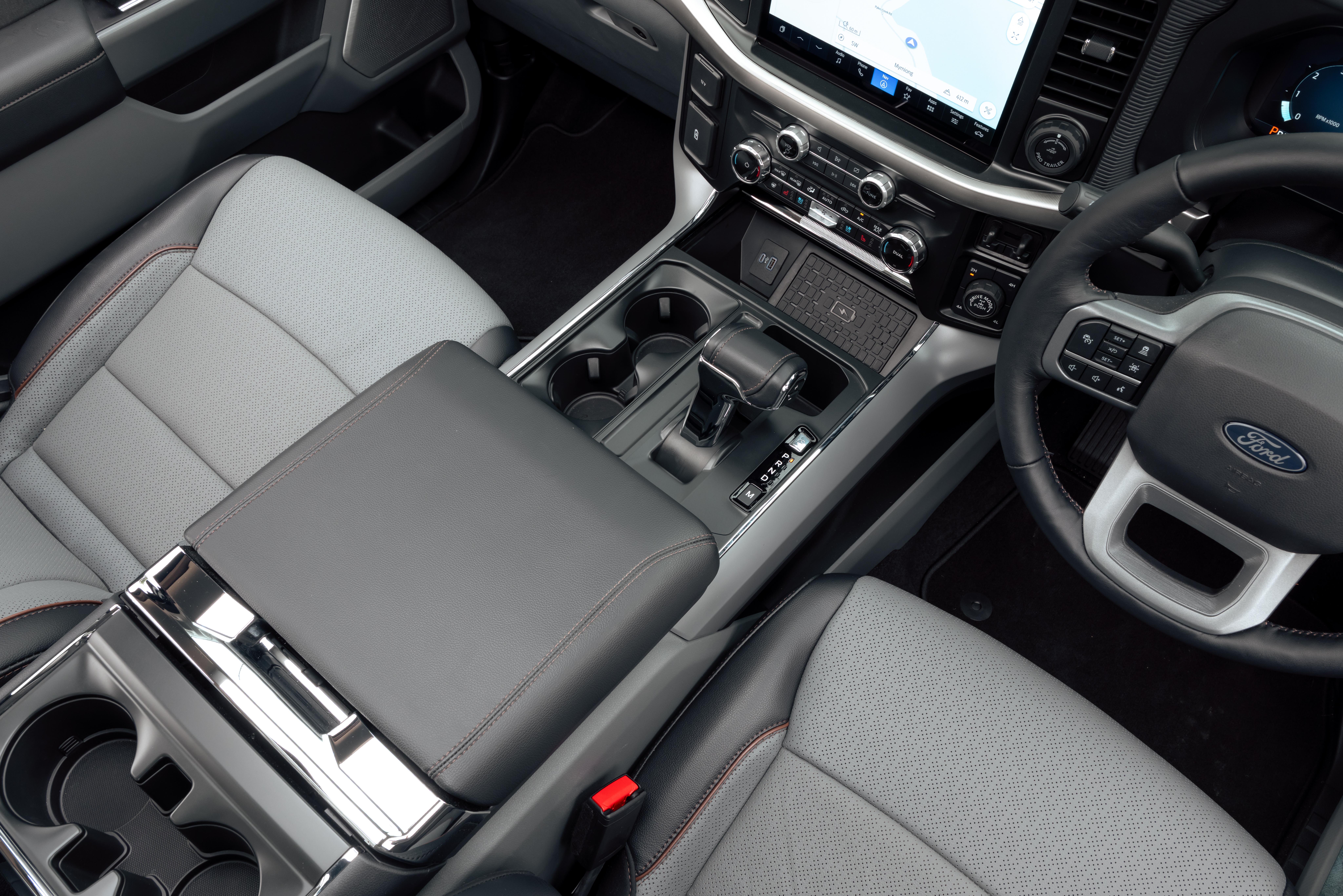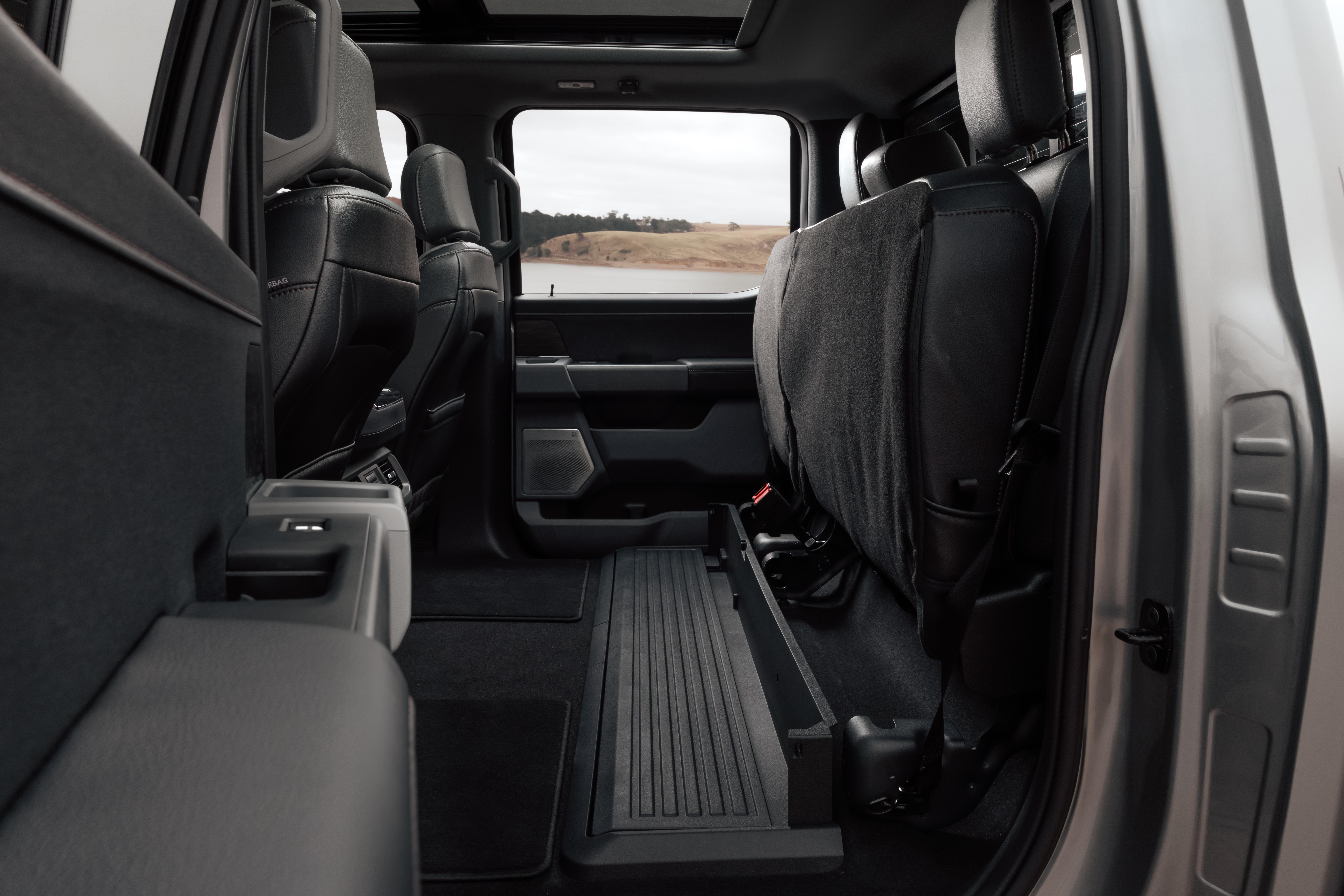 Amenities in the rear include air vents and fan controls, additional USB-C charge ports. a fold-down centre armrest with cupholders, bottle holders in the doors, and map pockets behind the front seats. Lariat and Platinum grades also get heated outboard rear seats.