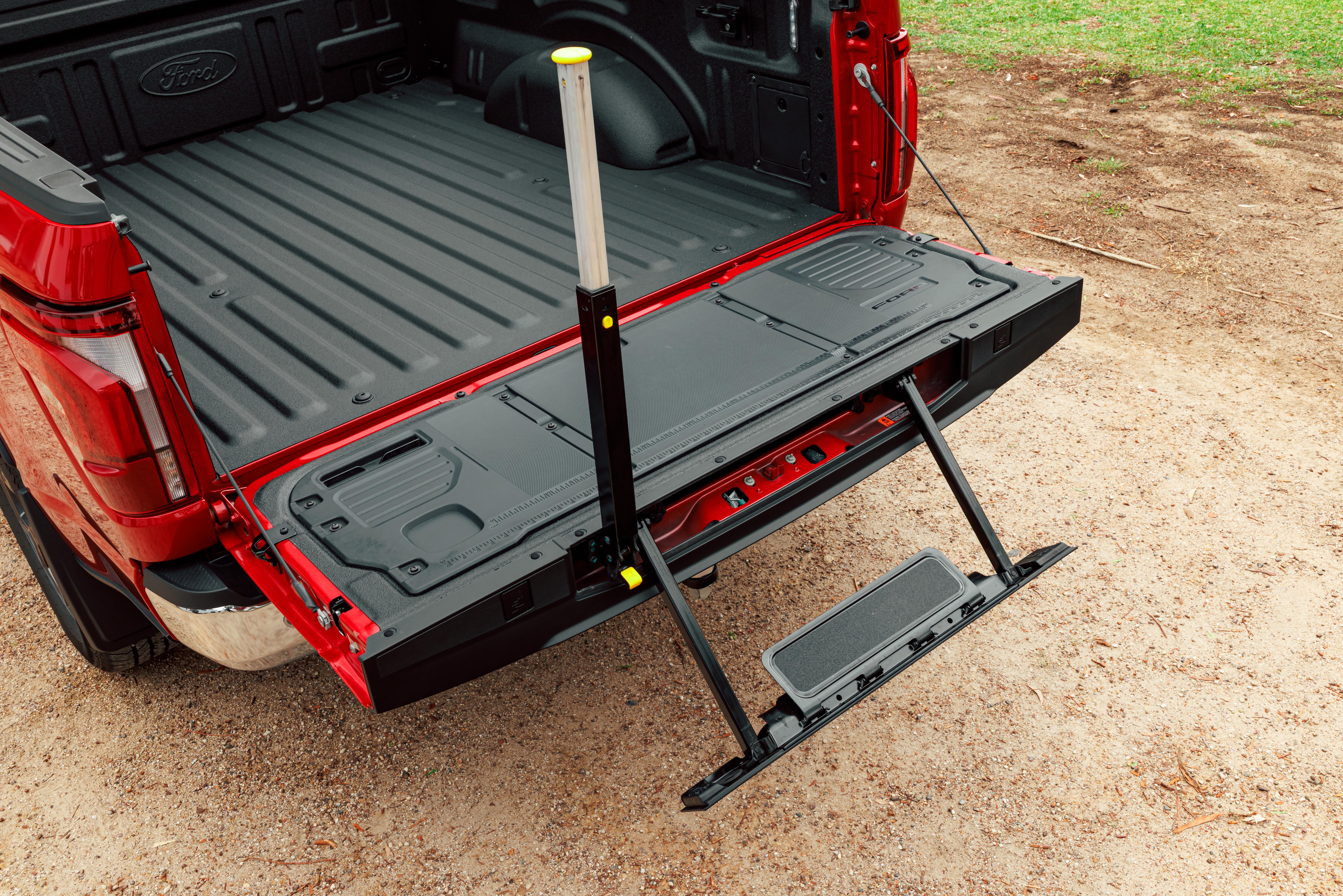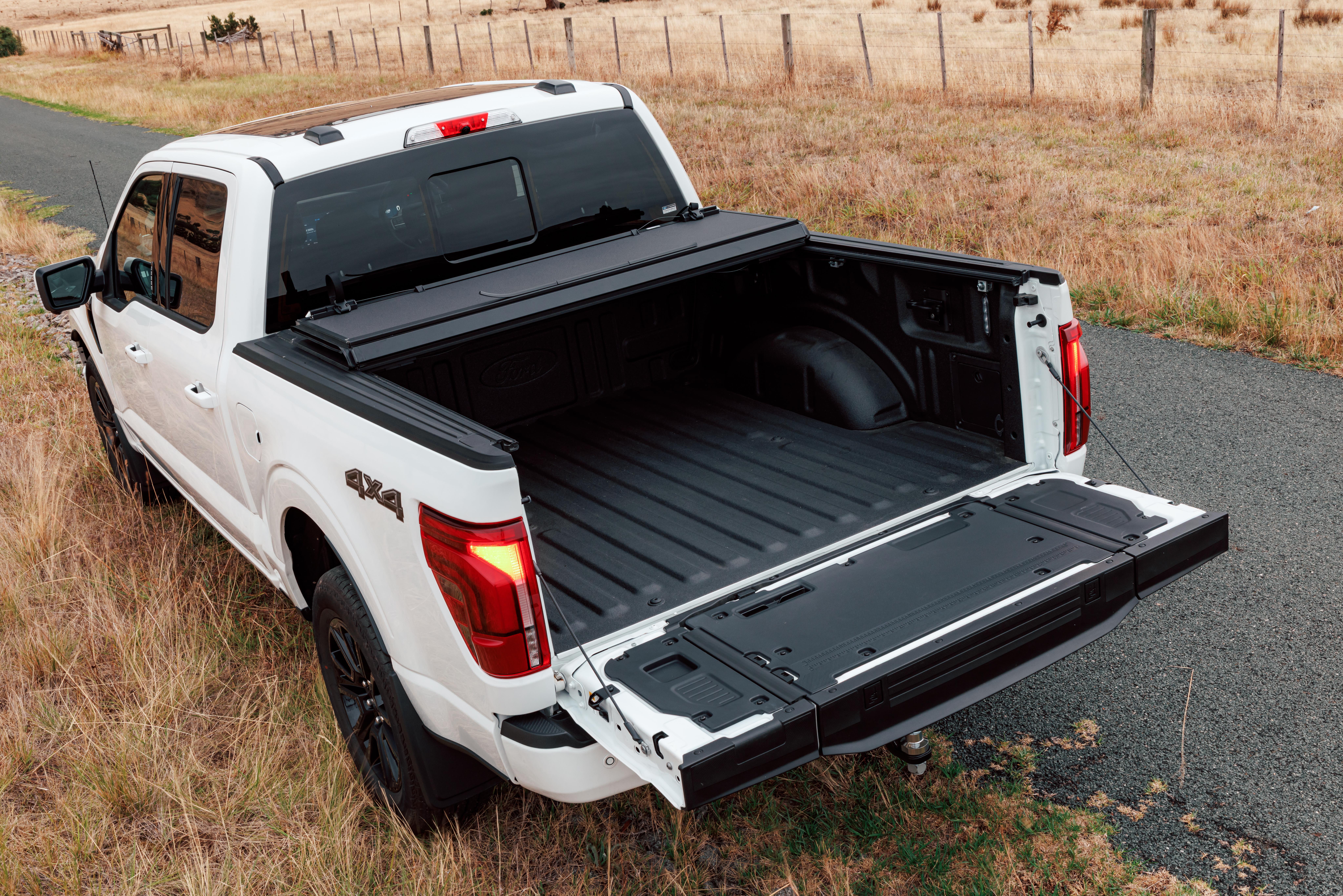 All F-150 vehicles come with ‘Load Box Elements’ like a 12V socket in the bedliner, inner tie-down points, locking cleats, illumination, a power tailgate lock, as well as a work surface and ruler built into the inner tailgate. Another handy feature is the pop-out side step to clamber in.