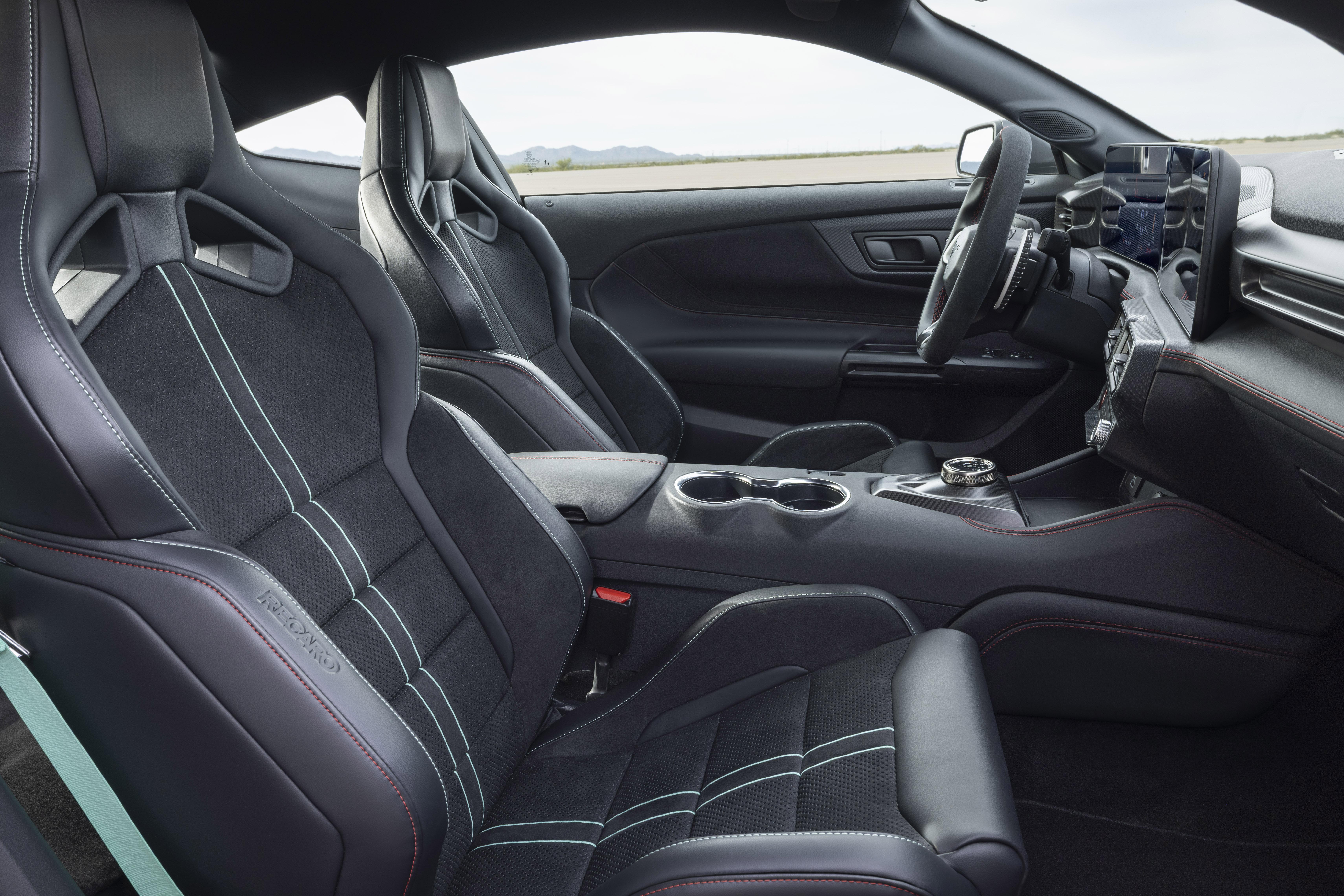 The regular Dark Horse SC features the GTD’s leather-wrapped flat-bottom steering wheel with Alcantara and carbon-fibre accents, and is also available with the Track Pack’s standard leather and Dinamica-trimmed Recaro sport seats.