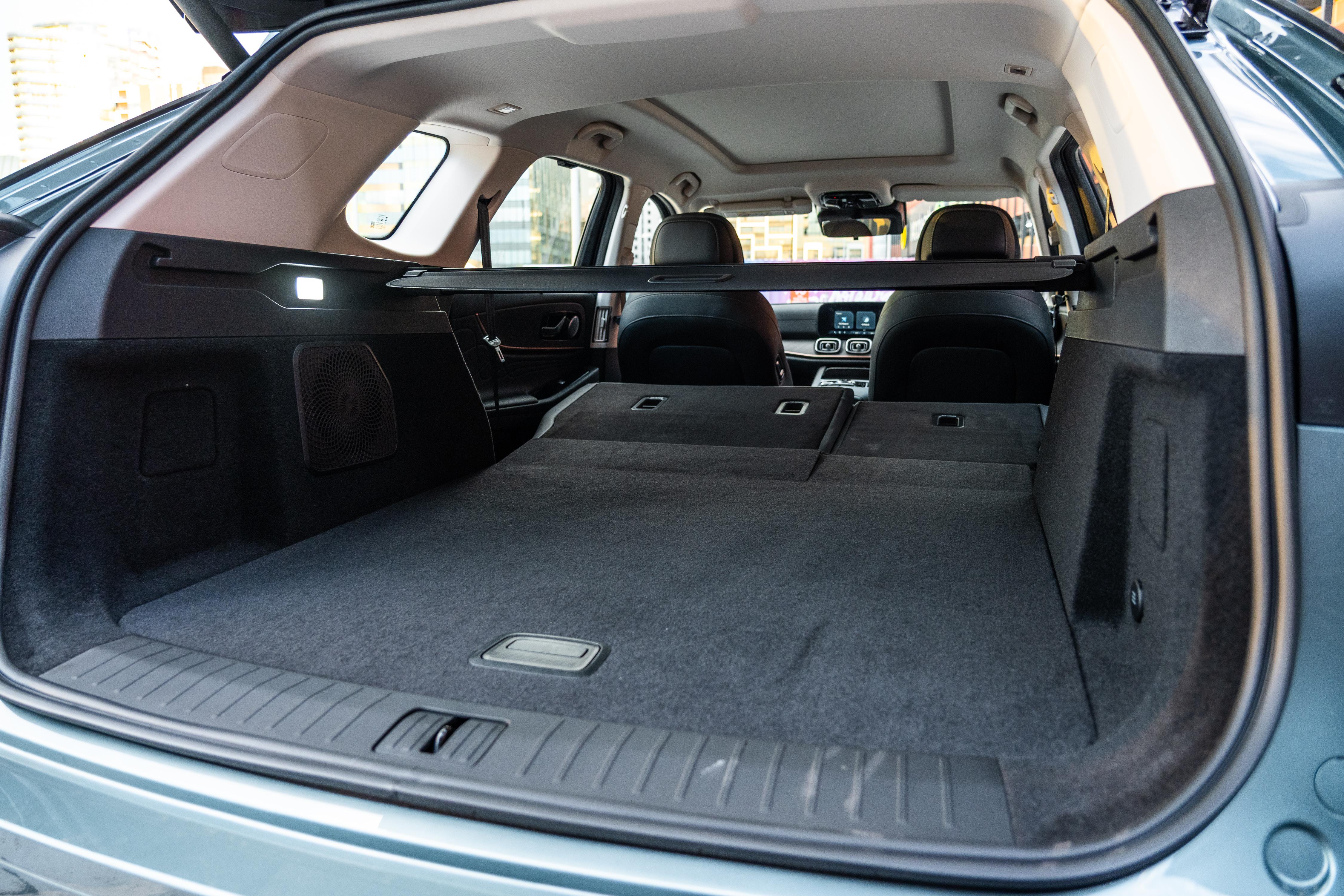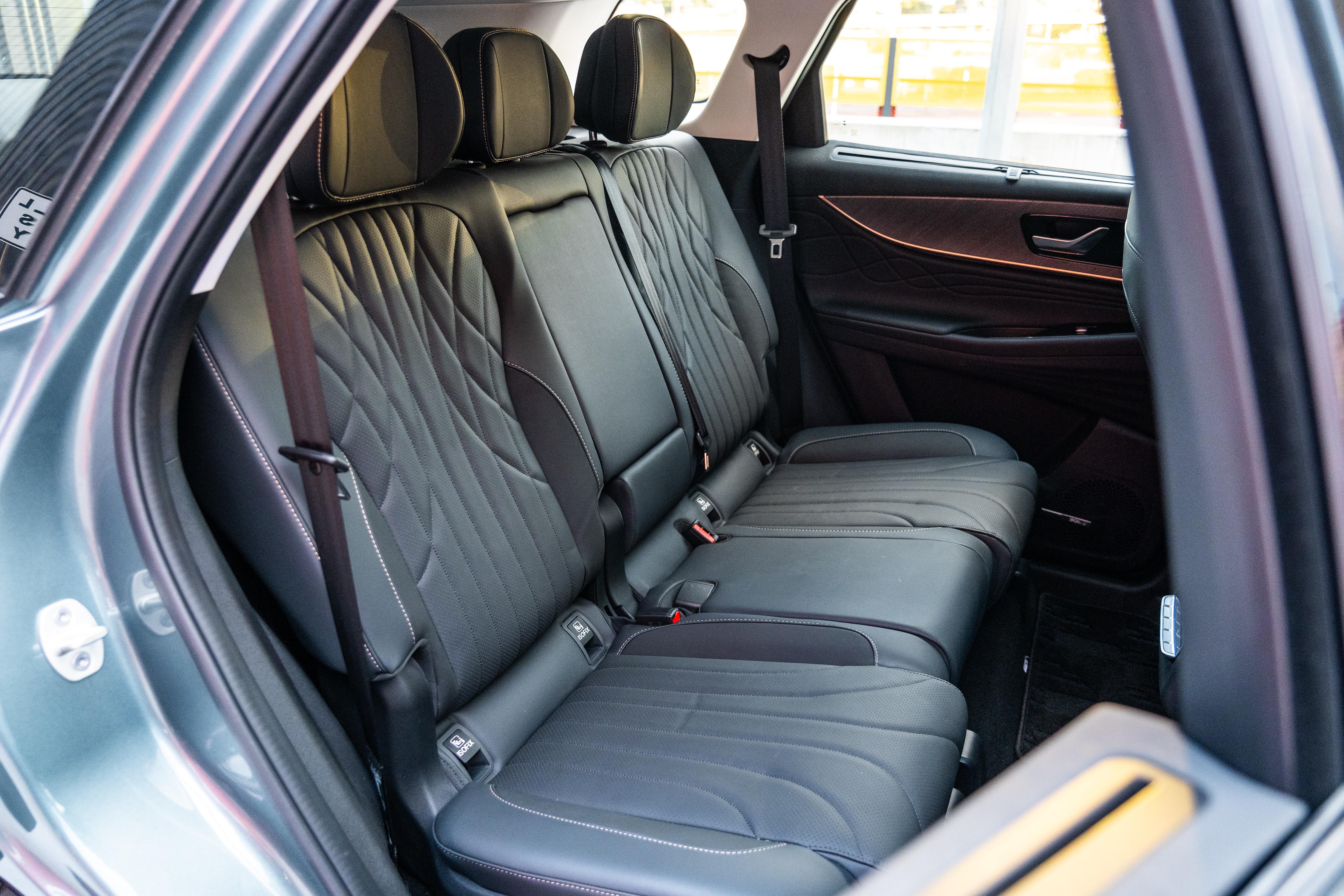 Rear air vents with fan controls bolster the dual climate zones up front, and you can also use the side-mounted electric seat controls to open up more space on the passenger side in a very Korean-esque way.