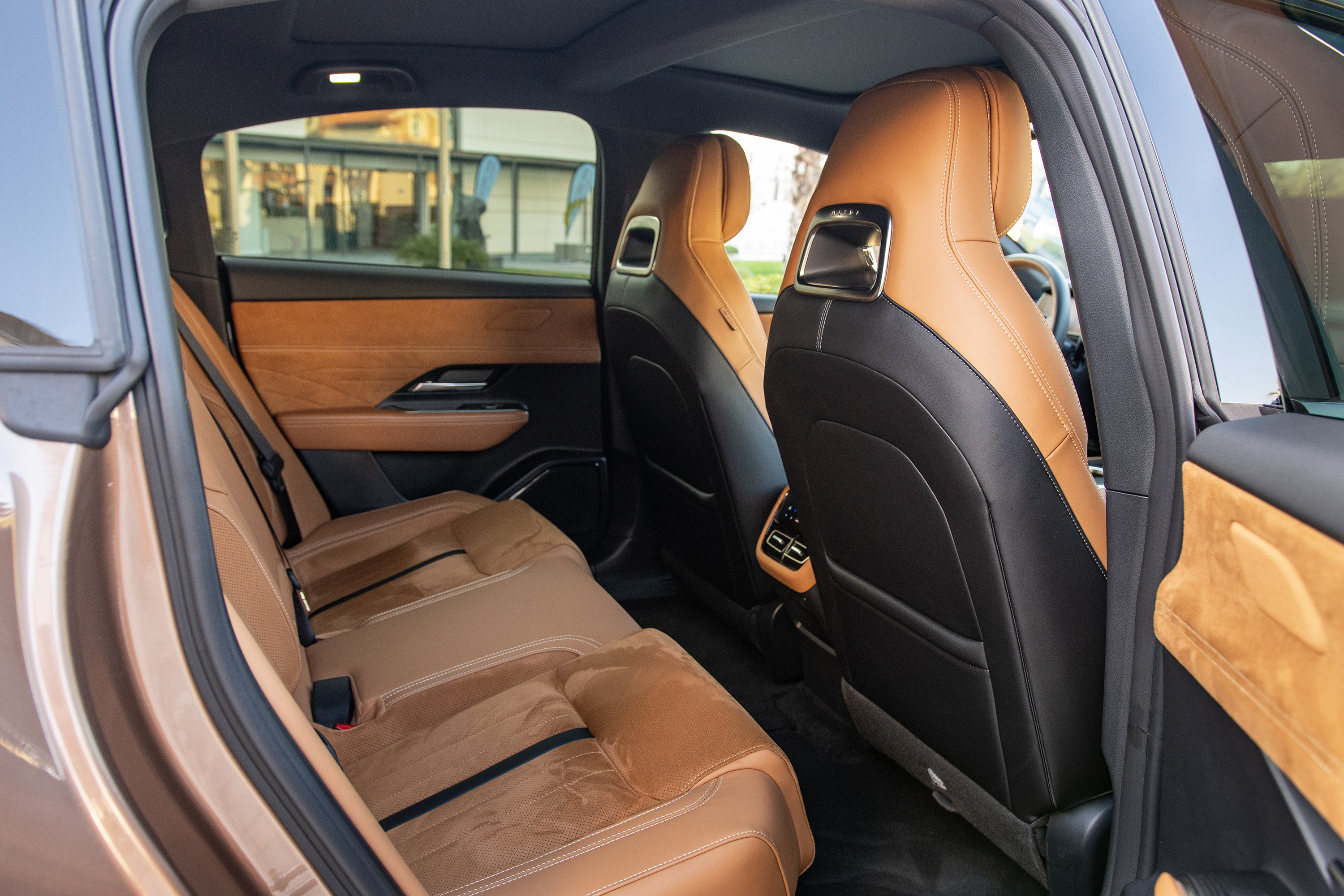 - Tan leather and synthetic suede seat trim with quilted stitching