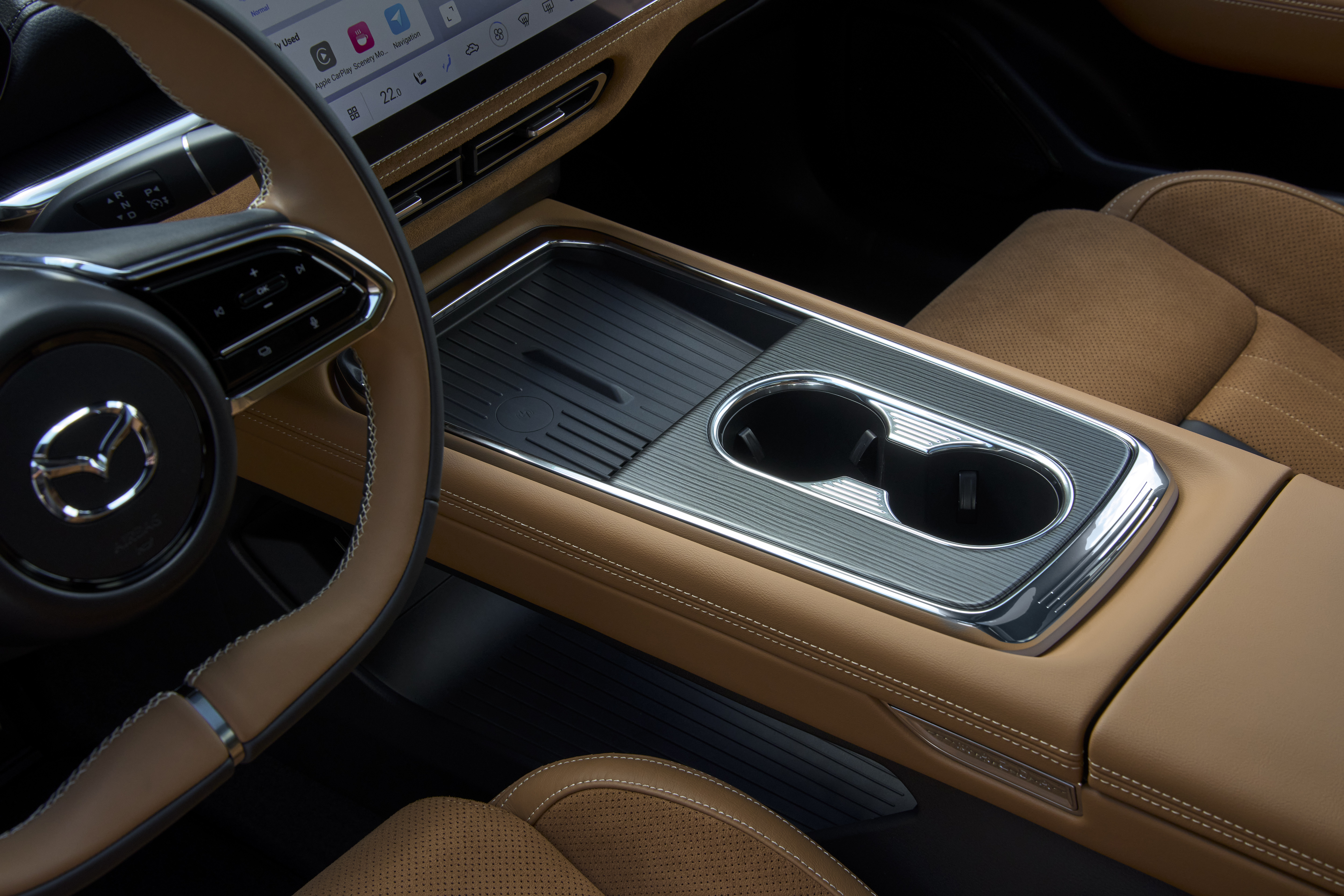 Below the screen is a wireless phone charger and there's storage space between the front occupants with USB-C outlets. The central armrest is also wrapped in leather and opens to reveal another large storage bin.