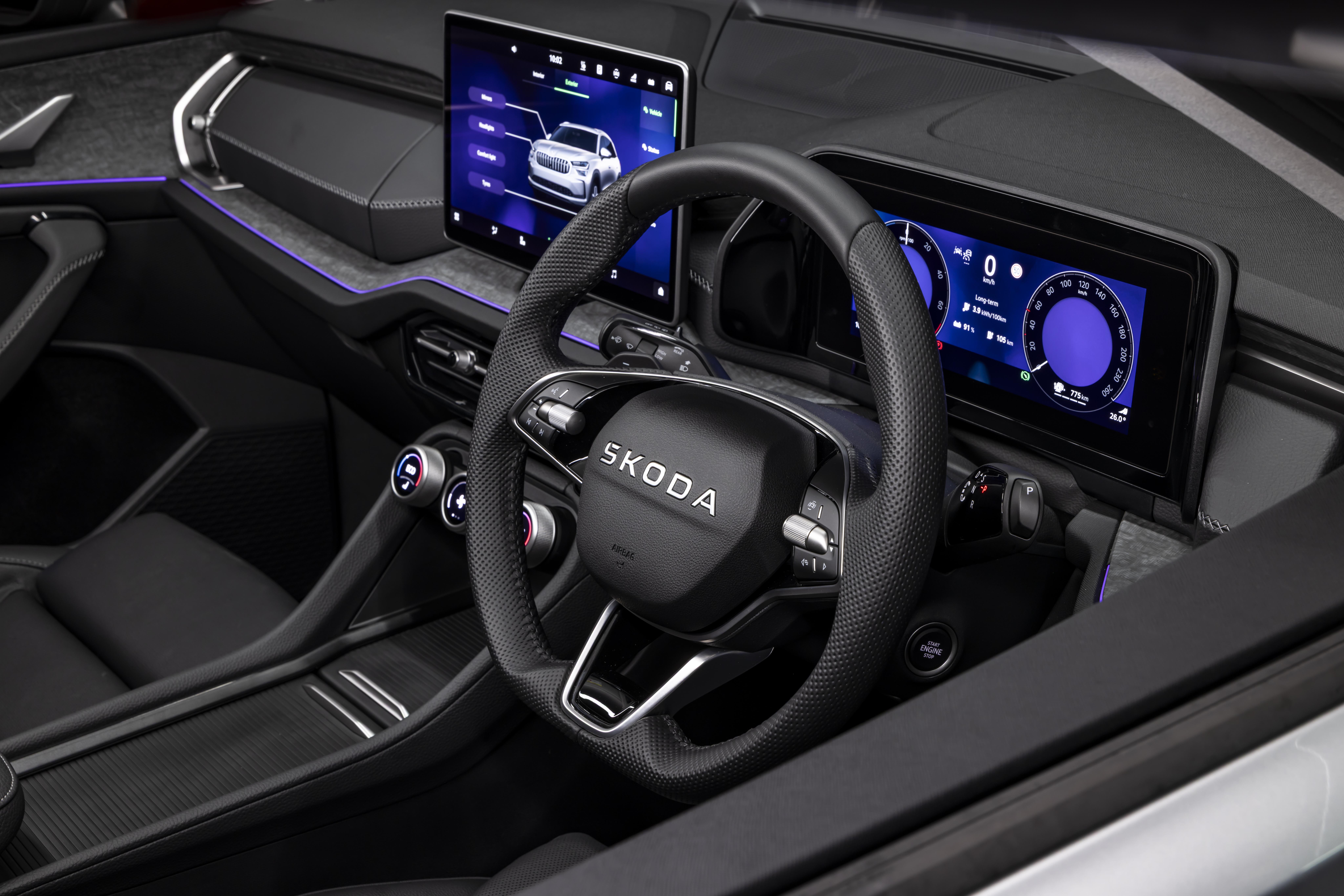 As is the layout of the cabin, which prioritises functionality over design to its benefit. Audio and display adjustments can be made via clearly labelled buttons on the steering wheel, while the centre stack is home to a trio of digital dials – modern, yet simple. There’s more to these dials than meets the eye, though, as they’ve been treated to some of Skoda’s ‘simply clever’ magic.
