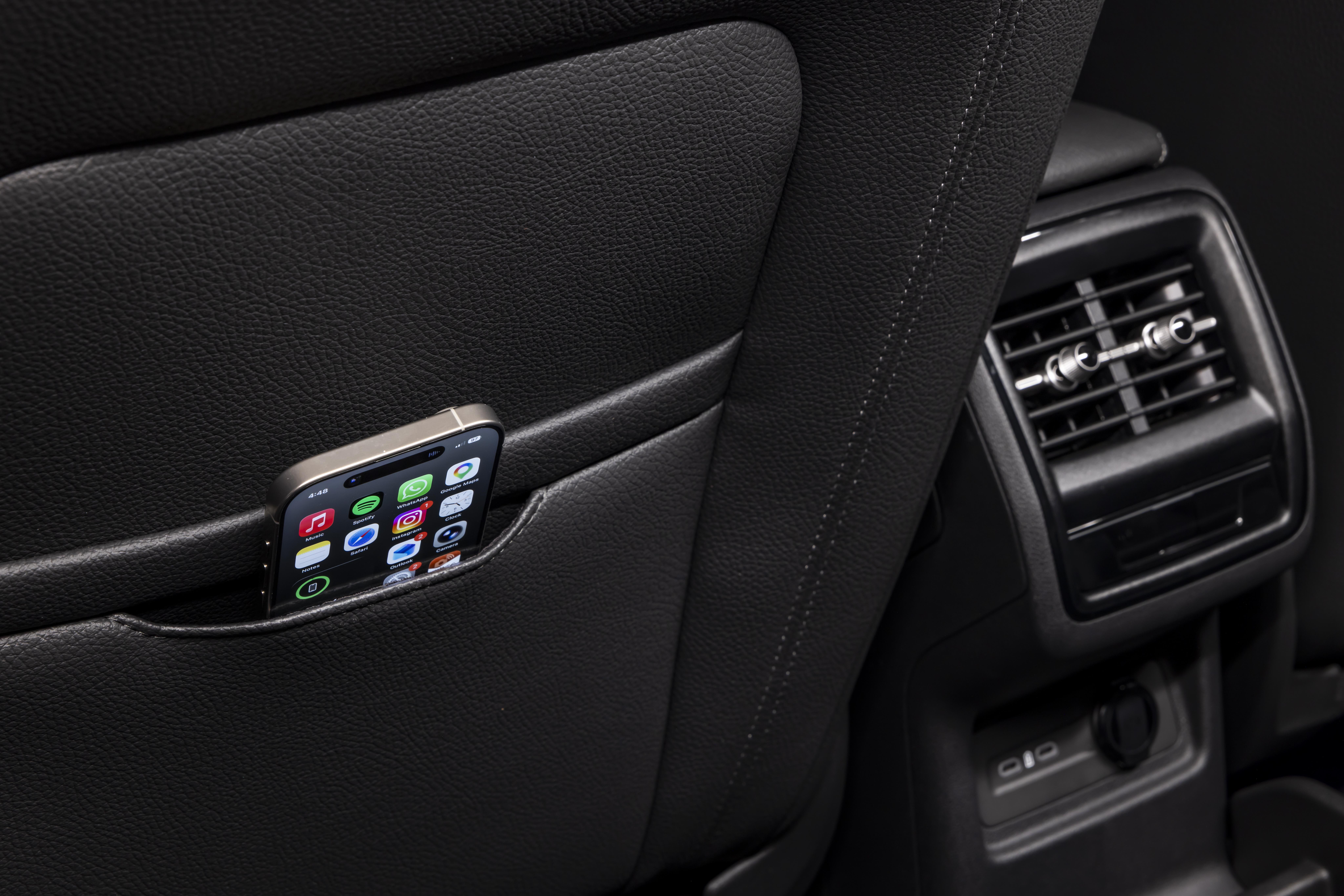One of the aforementioned phone pads doubles as a wireless charger, and two nearby USB-C outlets also serve to keep devices powered up. A wired connection isn’t required for smartphone mirroring, so you’ll never rue forgetting a cable.