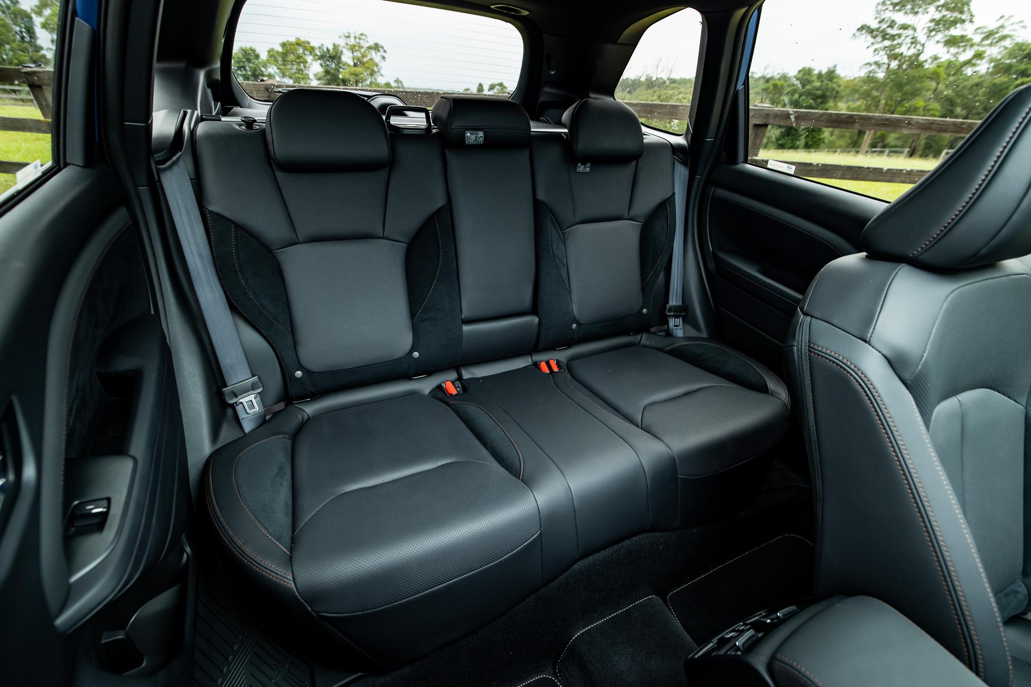 Subaru’s storage smarts run through to the rear, with multiple pockets on the seatbacks, door storage that fits bottles easily, and a flip-down armrest with cupholders.