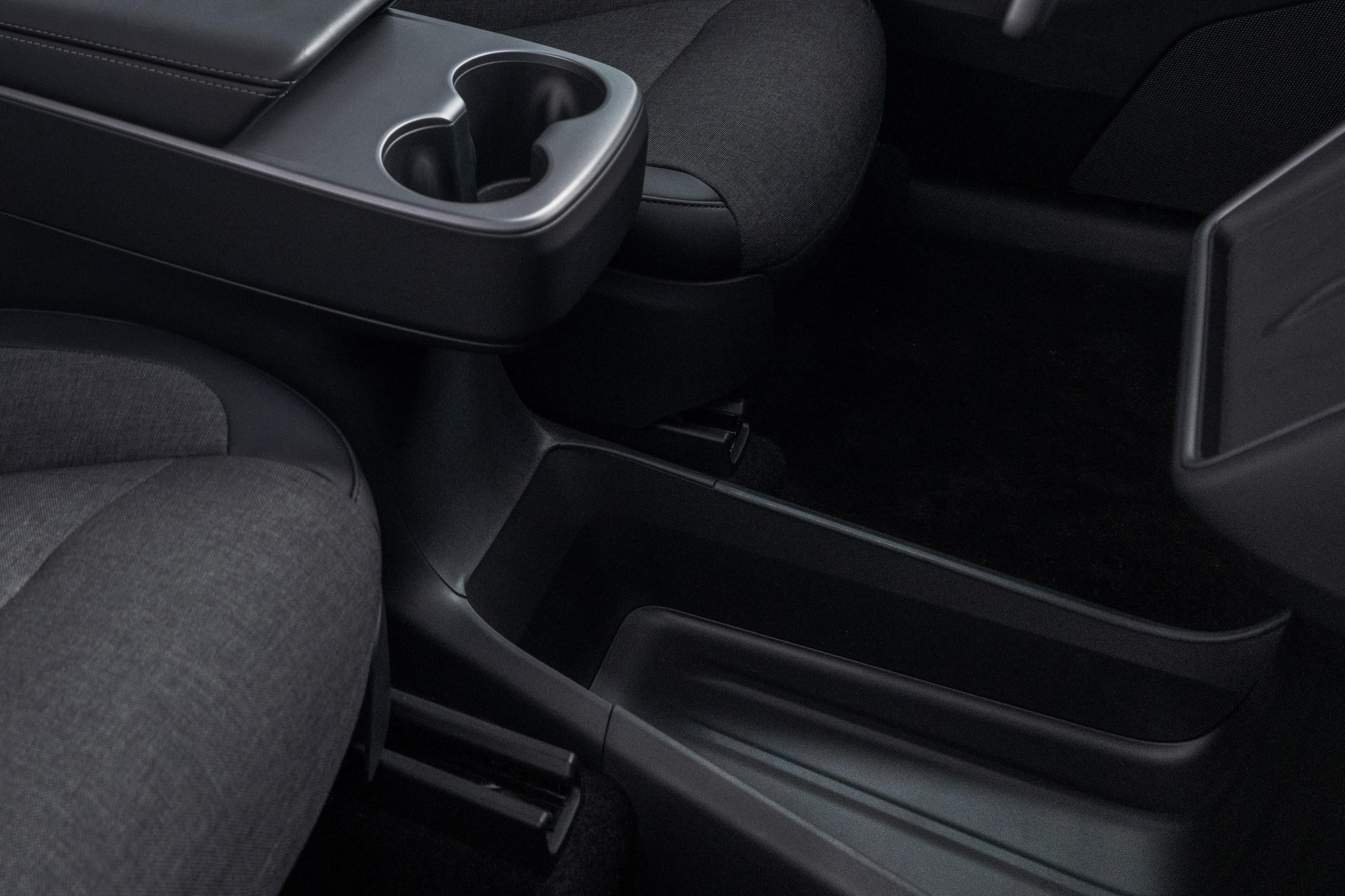 There’s a simpler, more open centre console to start with. Where the rest of the lineup has copious amounts of closed storage between the front seats, the Standard makes do with a shelf of sorts – though it’s still of useful size. The Model Y’s dual-wireless smartphone charger is present, though it’s more plastic to the touch, and the cupholders that can be covered elsewhere in the range are always exposed in the Standard – no hardship unless you’re obsessed with the clean, minimalist aesthetic.