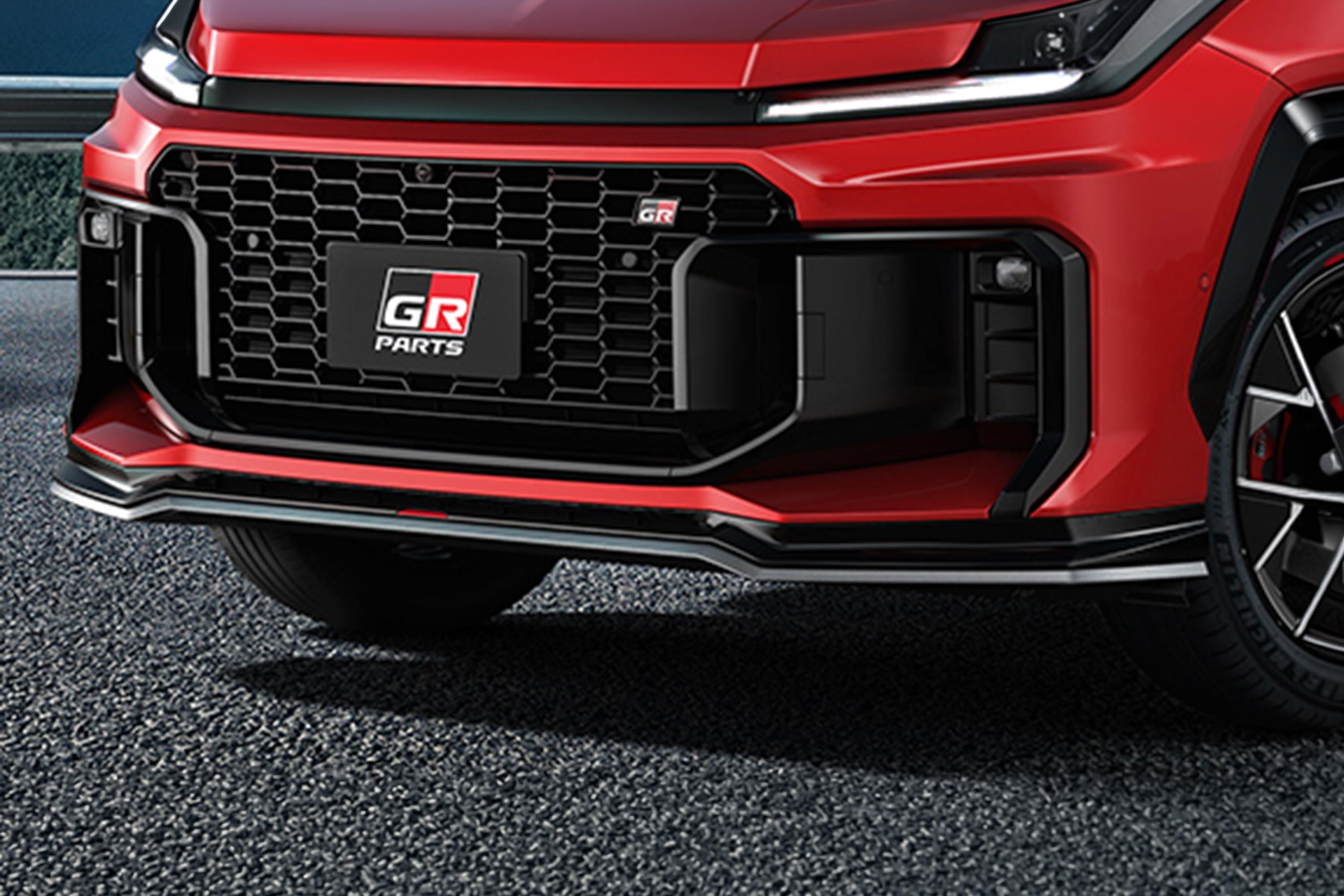 A chunkier front bumper with a larger grille, described as 32mm bigger than standard, is also offered in gloss black and gunmetal finishes to contrast with the GR Sport’s Feverish Red hero colour.