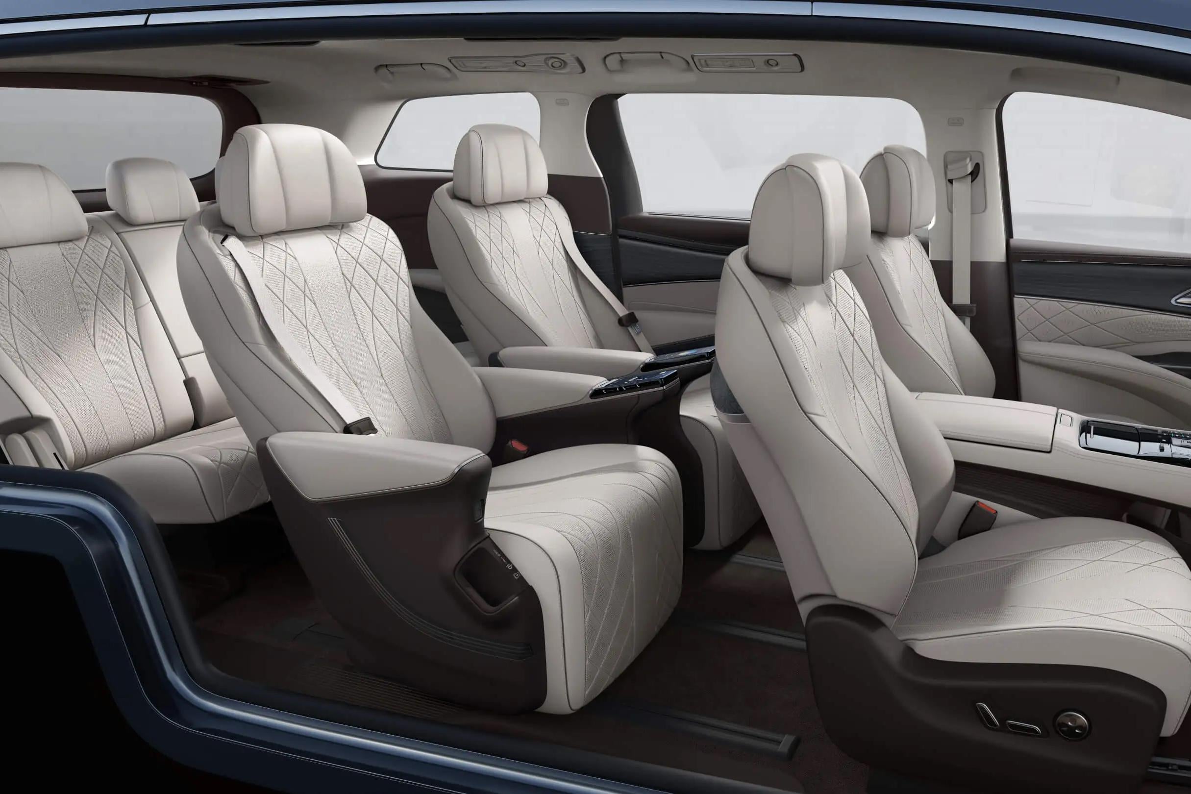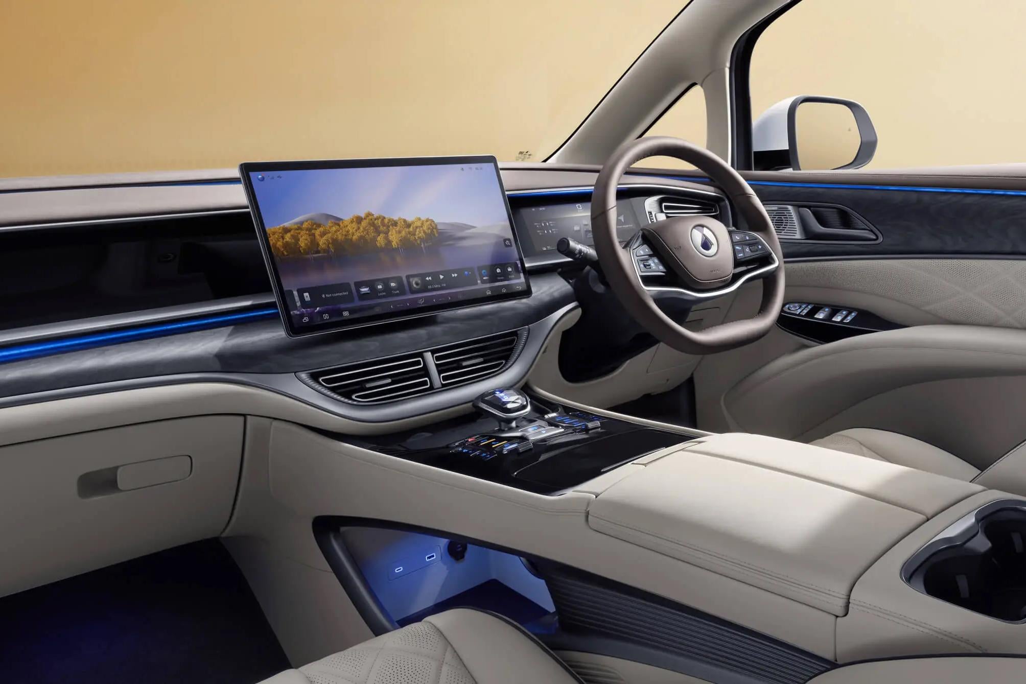 The seven-seat D9 has a 2+2+3 configuration, with second-row captain’s chairs featuring heating, ventilation, massage, power leg rests, four-way lumbar support, and position memory. Each chair is also fitted with a 5.5-inch armrest touchscreen for seat adjustment, climate control, and entertainment.