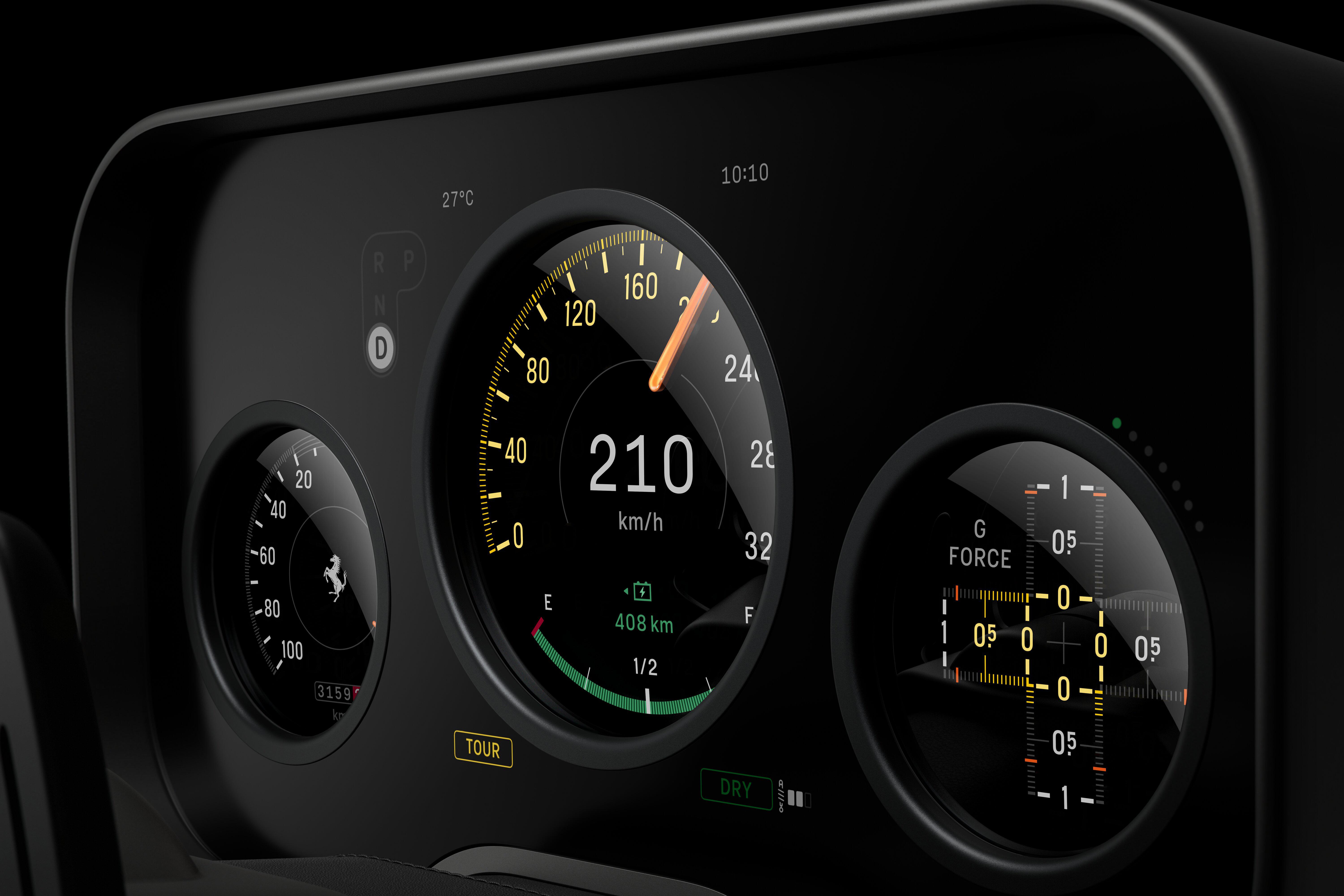 Ferrari has sweated the details, even employing a new, custom typeface in the interior “informed by historic Ferrari type and Italian engineering lettering”.
