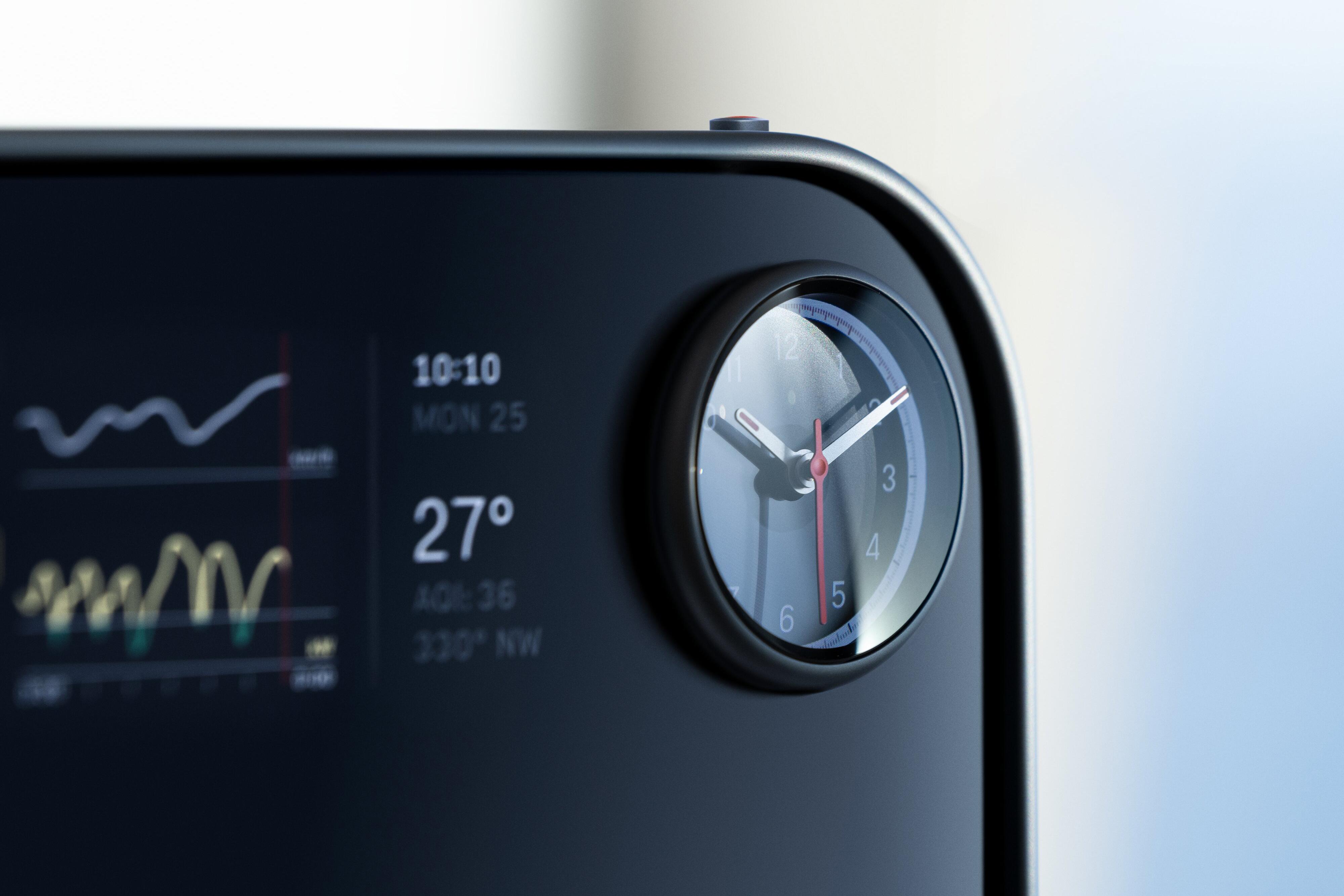 “Three large cutouts strategically reveal the information generated by a second display behind the top panel, creating a fascinating visual depth that captures the eye,” Ferrari explains.