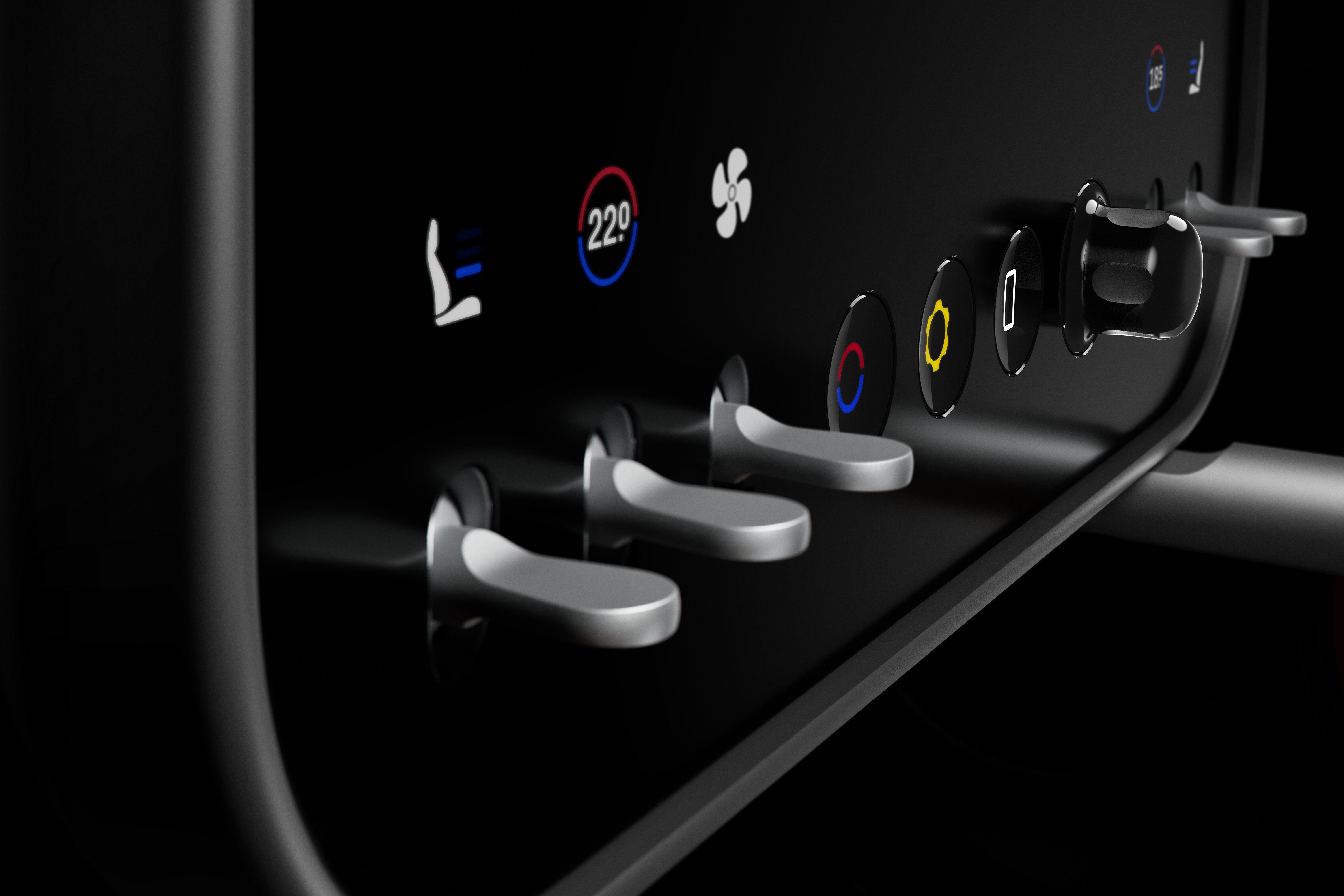 The centre control panel is mounted on a ball-and-socket joint so it can be oriented towards either the driver or the passenger, and features a palm rest to make it easier to operate.