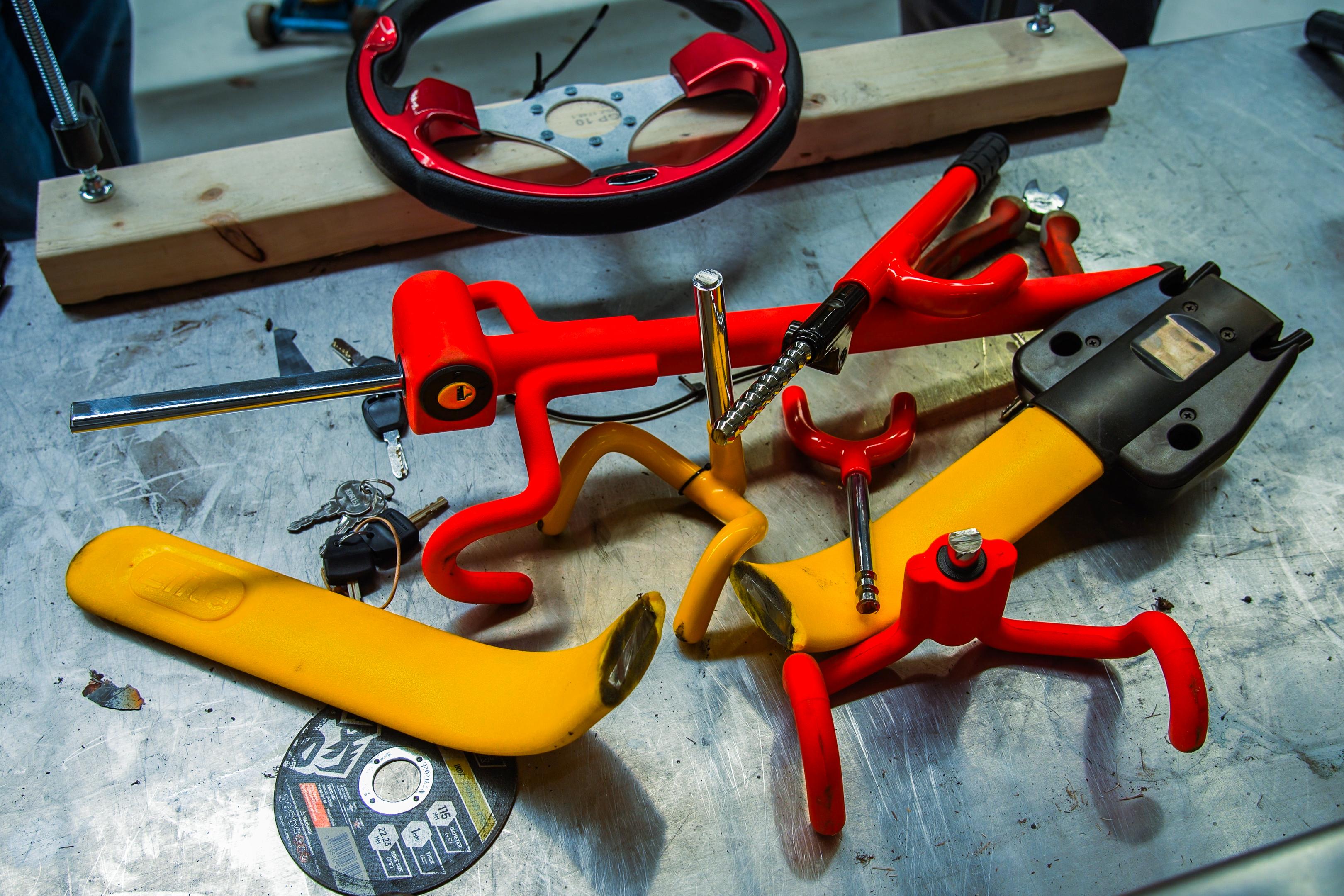 We lined up a small group of steering wheel locks spanning the price spectrum, including a budget unit around the $30 mark, another slightly more expensive option at $40, a mid-tier ‘yellow’ design for $175 with a bulky plastic outer section, and the genuine Toyota lock at the top of the pile.