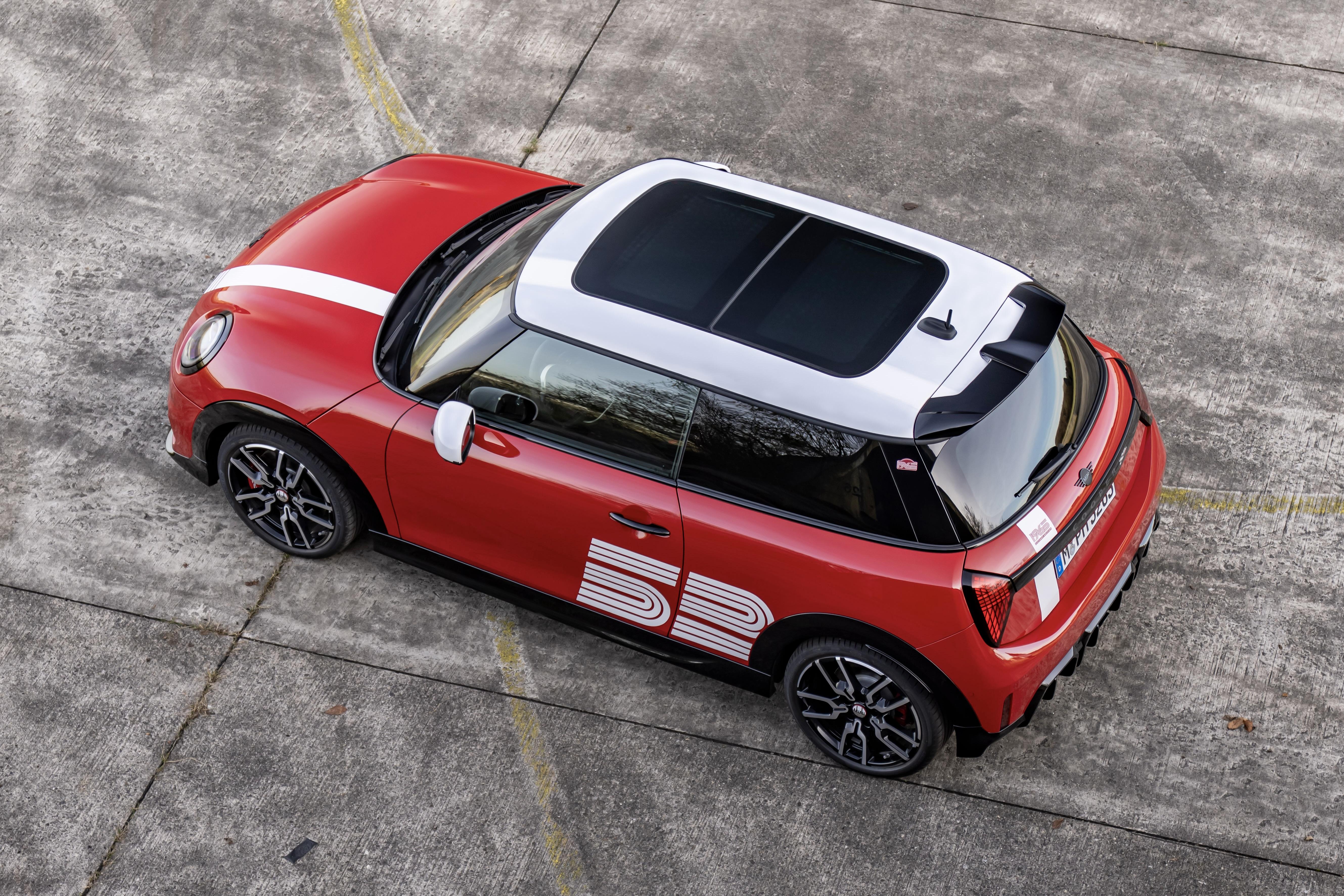 Referencing the red-and-white Cooper S from 60 years ago, the special-edition Cooper JCW is finished in the brand’s distinctive Chili Red exterior paintwork with a white stripe and roof, and features several celebratory Easter eggs inside and out.