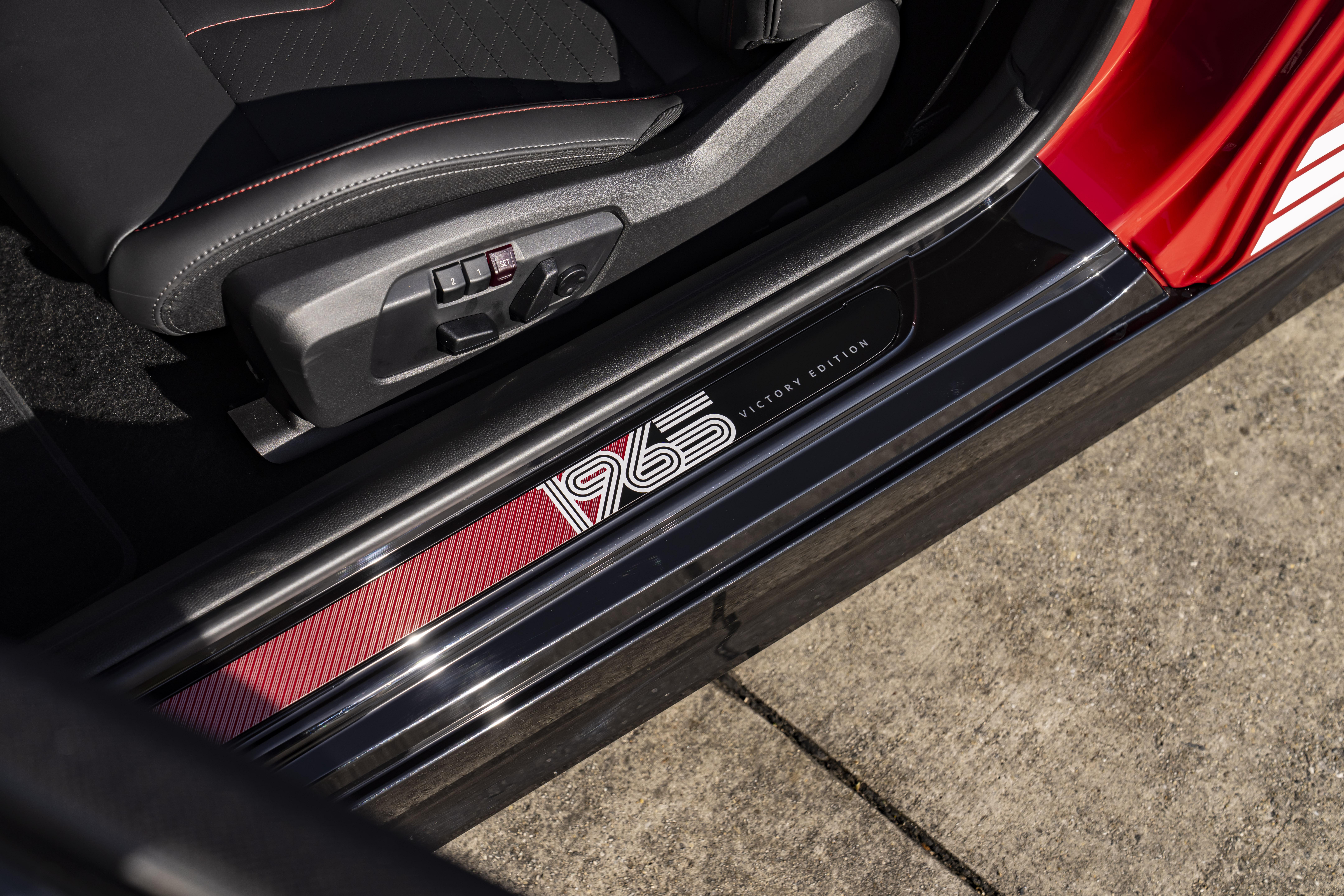 More ‘1965’ graphics appear on the Cooper’s illuminated door sills, the bottom spoke of the steering wheel, and the centre console storage box. A plaque is also fitted inside the doors, referencing the original car and its winning drivers.