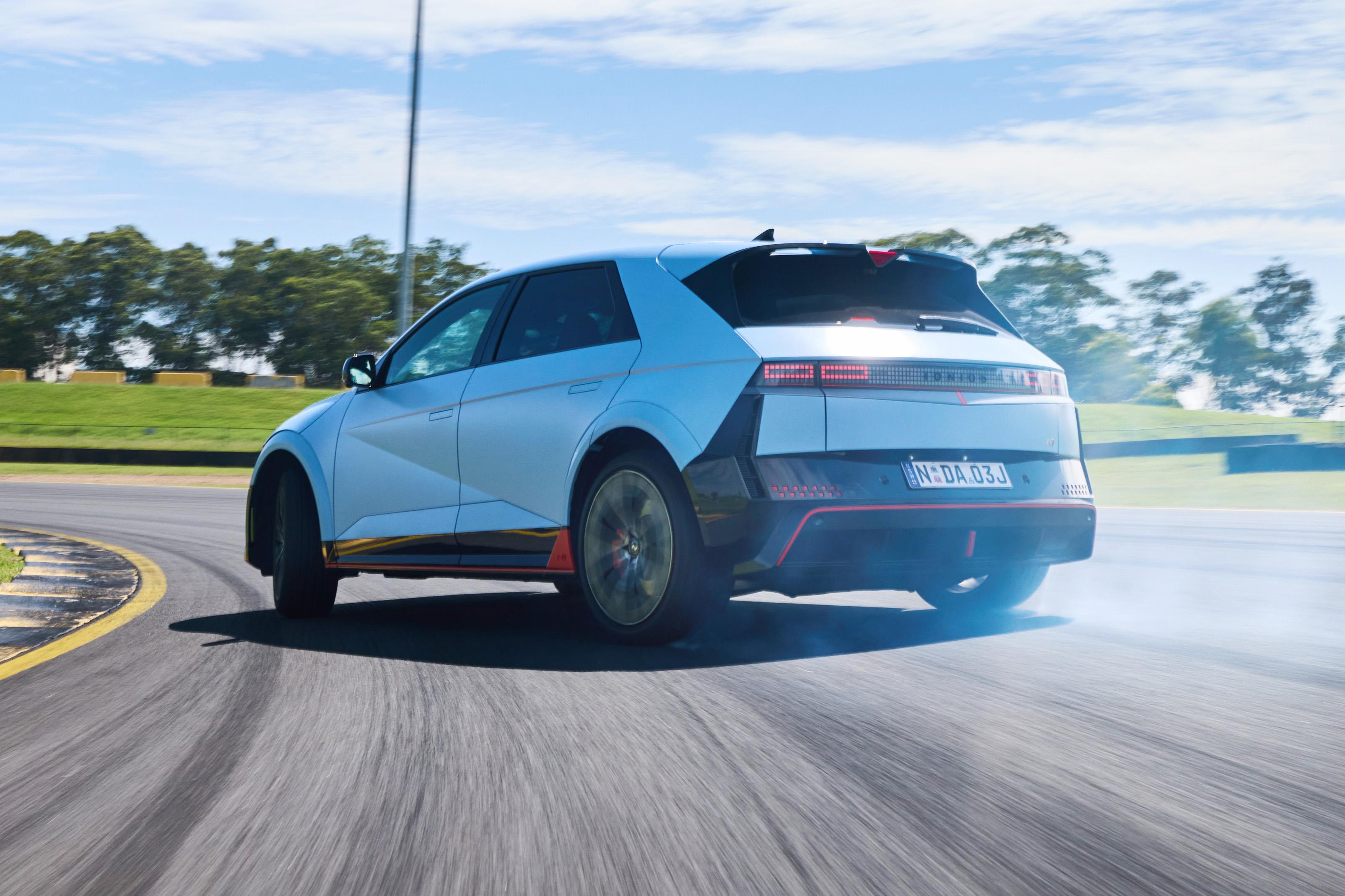 While the Hyundai Ioniq 5 N is an SUV (of sorts) rather than a sports sedan, and it’s still not what you’d call affordable at $115,000 before on-road costs, it can shed all four of its tyres thanks to no less than 448kW of power and 770Nm of torque.